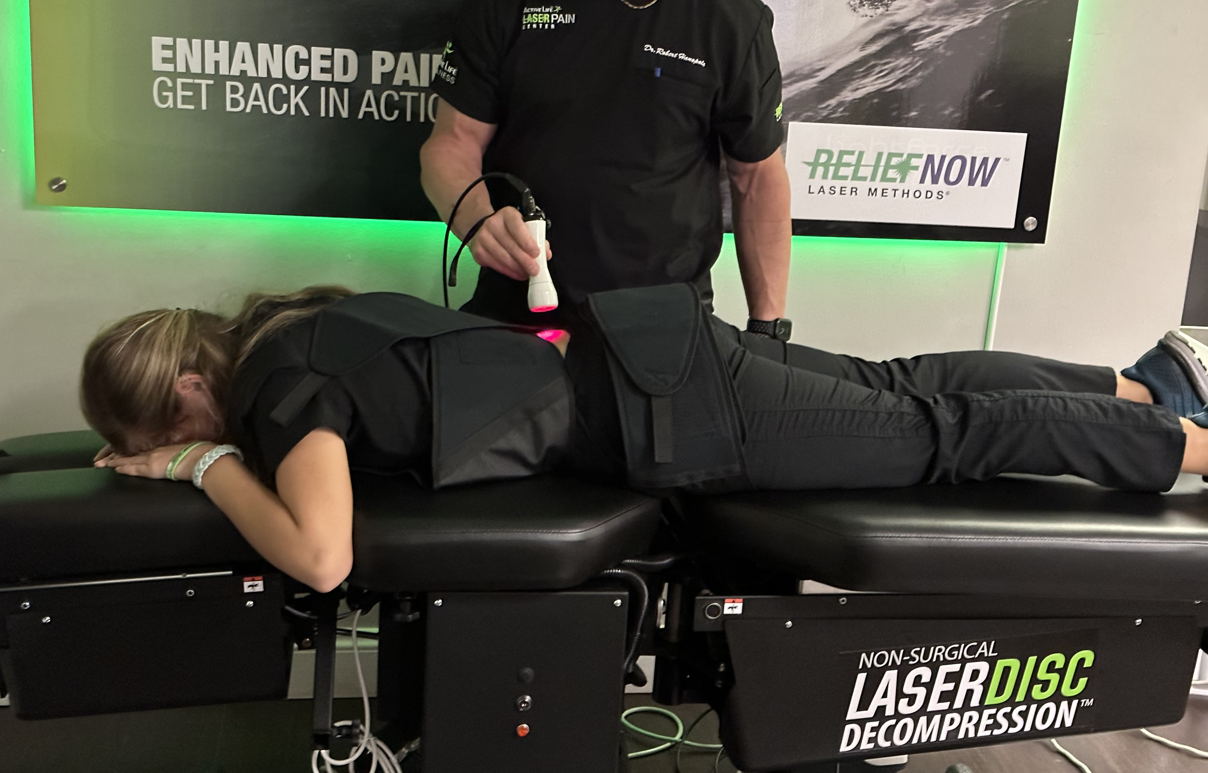 The Disc Decompression ReliefNow™ Laser Method is a highly effective and safe treatment option for back and neck pain caused by bulging or herniated discs as well as other serious degenerative spinal conditions that cause debilitating back pain, neck pain and sciatica. This therapy combines non-surgical disc decompression and class 4 high power deep tissue laser therapy (LaserDisc Decompression) to provide patients with long-lasting pain relief and reduces their potential need for risky surgeries and reliance on medications which only mask the pain, have dangerous side effects and perpetuate the worsening of the actual condition. If you are suffering from back pain, neck pain or sciatica, talk to your ReliefNow laser Methods provider to see if the Disc Decompression ReliefNow Method is right for you!